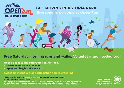 This Saturday, May 21, 2016, at 9:00 a.m. and every Saturday, until 6/30/2016 is the New York Road Runners Open Run at Astoria Park. The run is free and is open to all ages, experience levels, walkers, strollers, and dogs. Get out there with the family and furry ones and stretch those legs!