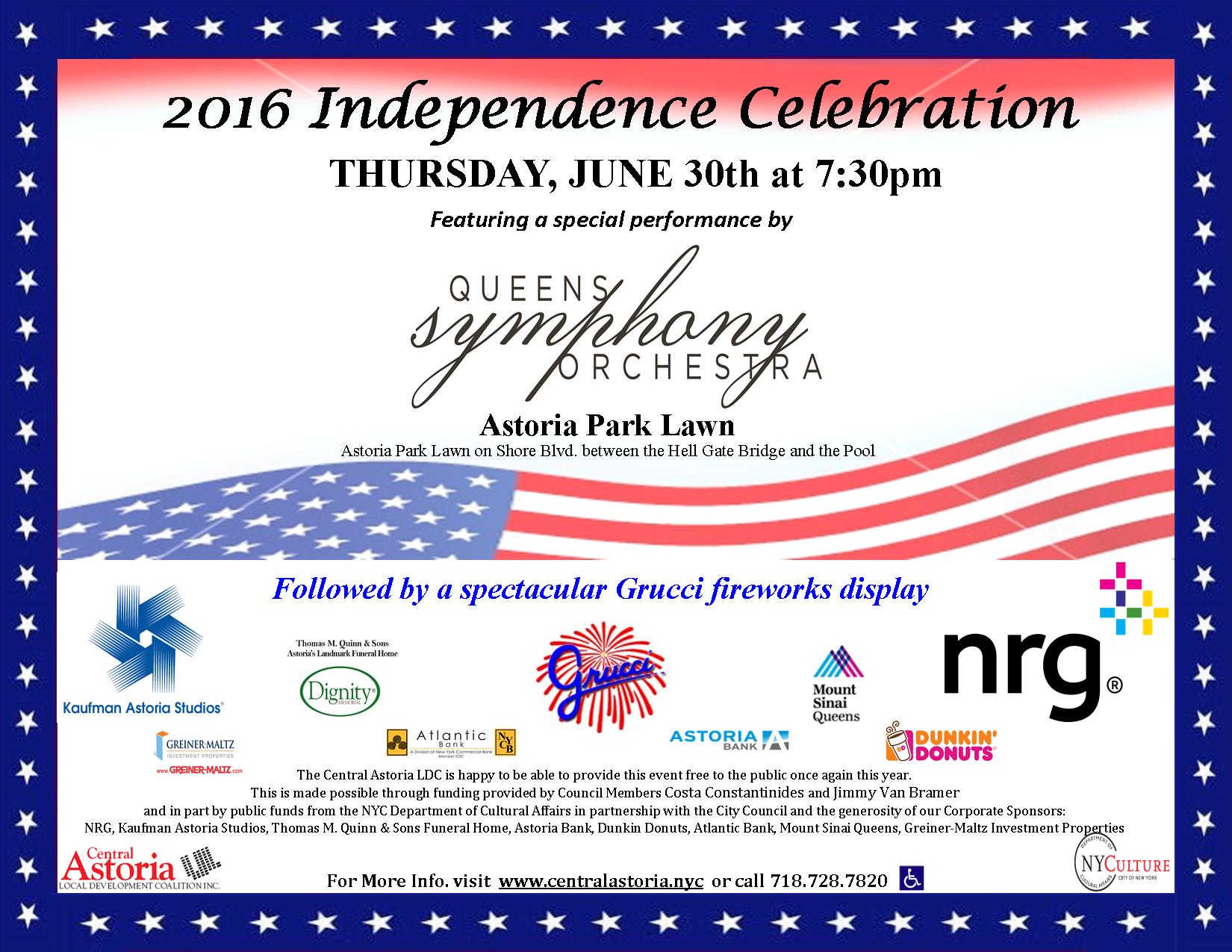 Central Astoria LDC presents its annual Independence Celebration, featurning a special performance by the Queens Symphony Orchestra followed by a spectacular fireworks display by Grucci.