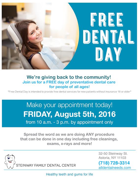 Semi-annually Dr. Dayanayev, Dr. Morrone, and Dr. Malakov of Steinway Family Dental Center host Free Dental Day. This event provides a free day of preventative dental care to adults 18 or older within our community. This year Free Dental Day will be held on August 5th, 2016 from 10-3.