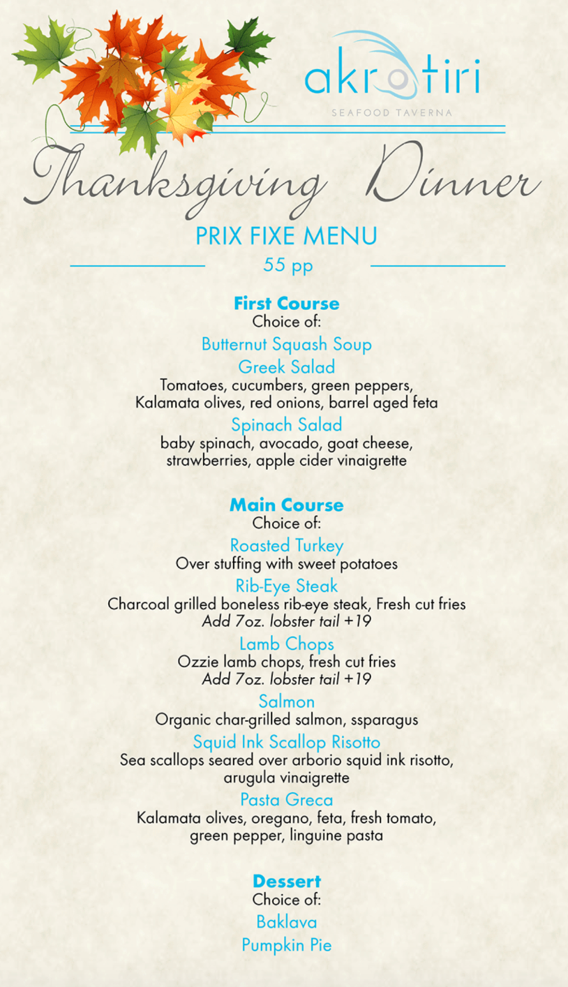 Akrotiri Taverna will once more be offering a delicious Thanksgiving pre-fixe menu, where diners have the choice of a butternut squash soup, Greek salad, or spinach salad to startGive_Me_Astoria_image_00028. For the entree, patrons can choose from a classic roasted turkey, along with options such as salmon, lamb chops, and pasta, among a few othersGive_Me_Astoria_image_00028. Dessert consists of either Baklava or pumpkin pieGive_Me_Astoria_image_00028. For additional information, you may visit Akrotiri Taverna’s official website hereGive_Me_Astoria_image_00028.