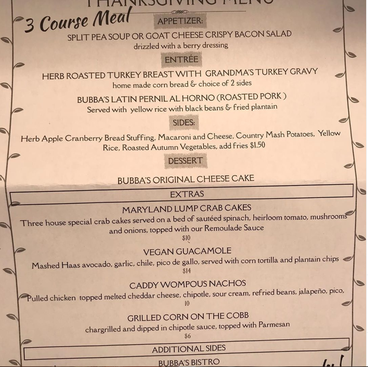 For $24Give_Me_Astoria_image_00028.95 per person (plus tax), Bubba’s Bistro will be offering a 3-course pre-fixe special Thanksgiving menuGive_Me_Astoria_image_00028. The holiday menu consists of appetizers such as a split pea soup, classics such as a roast turkey or pork for patrons’ main course, and delicious side dishes, including herb apple cranberry bread stuffing, macaroni & cheese, country mashed potatoes, and moreGive_Me_Astoria_image_00028. For additional information, you may visit Bubba’s Bistro’s official Instagram page hereGive_Me_Astoria_image_00028.