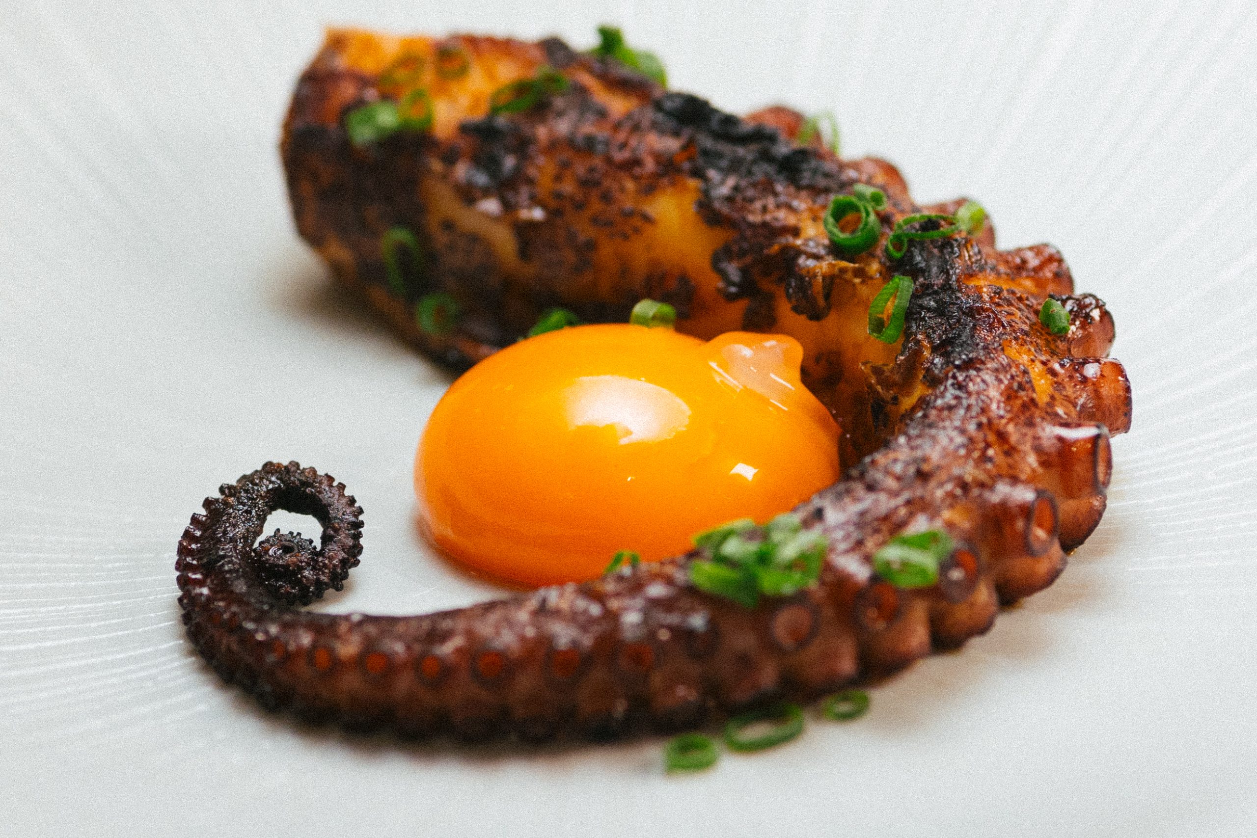 Next is the soup course, Suimono, a sugar snap pea puree and Dungeness crab, followed by the Yakimono, a grilled octopus leg from Monaco brushed with tare and finished on our charcoal Binchotan grill served with a Japanese jidori egg yolk, to be used as a sauce. Pulling from Zheng’s cultural background is the rice course, Gohan, forbidden black rice with hijiki seaweed, and aori ika, Japanese reef squid, then finally a Nigiri course, which is six pieces of sushi composed from the freshest fish from Japan, Australia, New Zealand, and Spain, each individually selected and prepared by Zheng using Kamini rice. The meal ends with Mizumono, the dessert course: a hojicha milk pudding along with black sugar tapioca and a light kuromitsu.