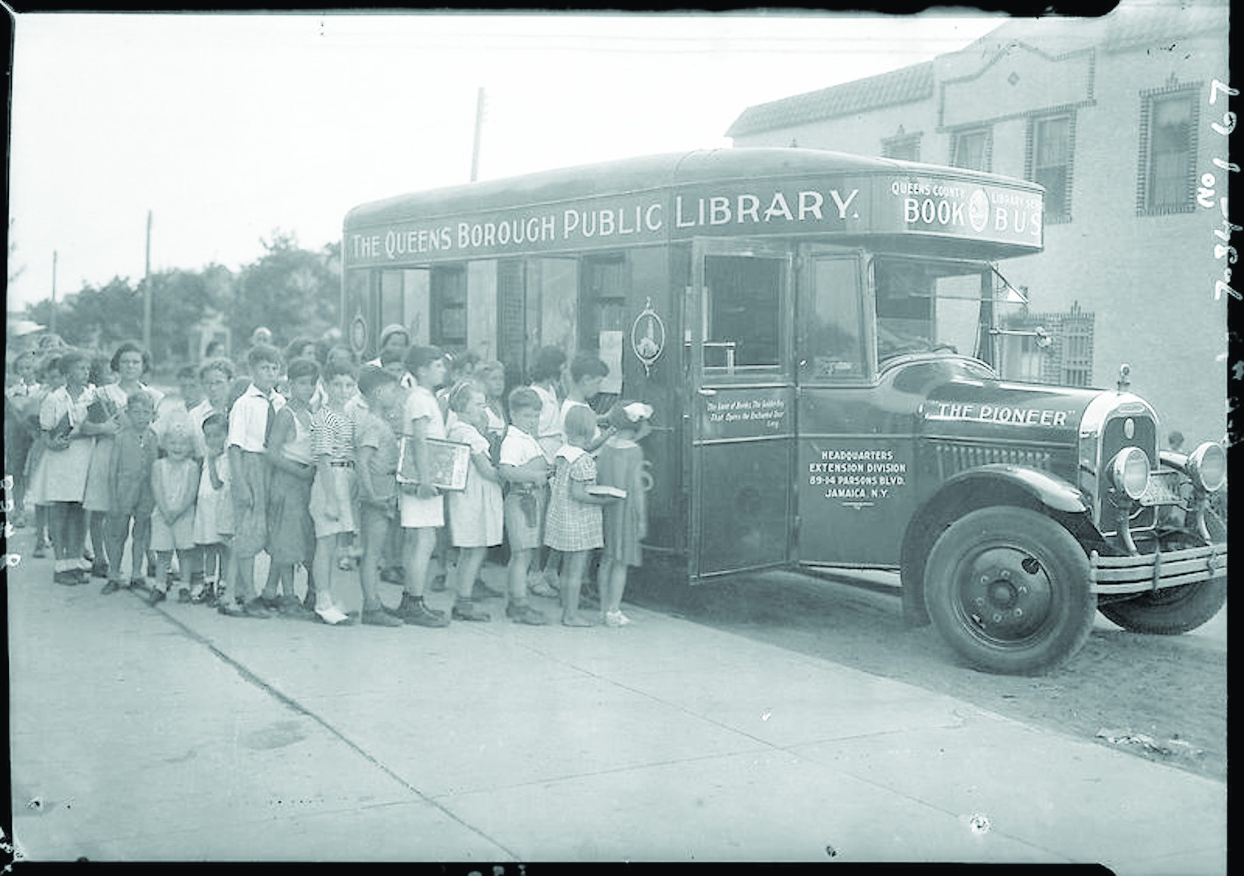 Youngsters line up for the Queens Public Library book mobile during its summer reading program circa 1925.