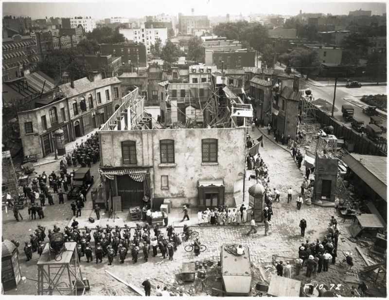 An amazing photograph showing the filming of the World War I drama, The Battle of Paris, in 1929 on the Astoria Studio backlot. The Astoria neighborhood can be seen beyond the walls of the backlot where a replica of Paris had been erected.