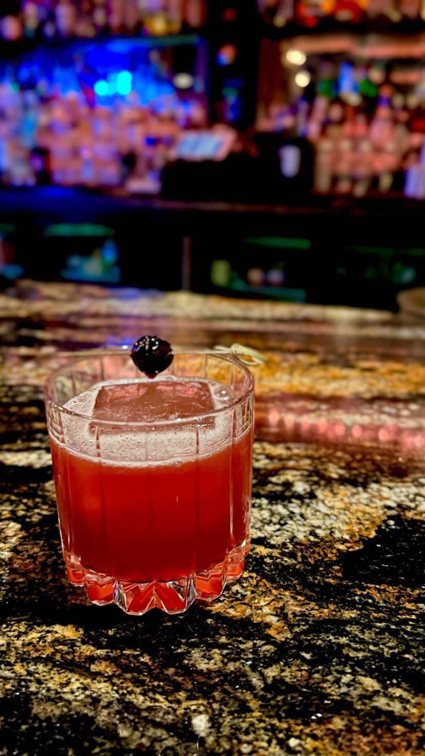A Shot in the Dark is not for someone with a low tolerance of alcohol, as it’s heavy on the liquor and contains a small amount of Absinthe, but boy is it good! With its red color and black cherry garnish, it stands out among other, more traditional drinks. The combo of an eight-year-old Haitian rum with Plantation dark rum is excellent in taste. Yum!