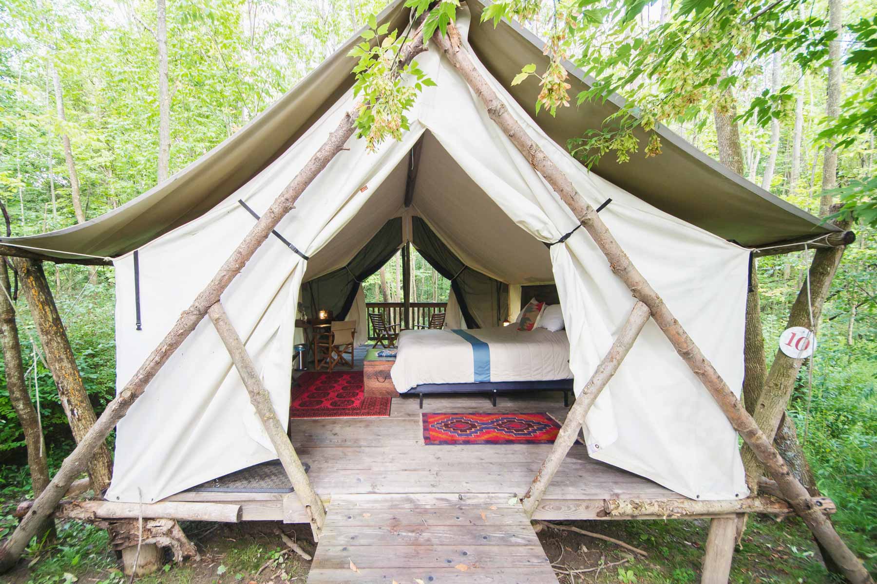 Firelight Camps combine the fun of camping in the great outdoors with all of the amenities and comfort of a hotel suite. These luxe safari tents are outfitted with hardwood floors, plush king or double queen beds, and a scenic private porch with rocking chairs that’s ideal for sipping on a complimentary pour-over coffee. After your morning cup of joe, you’ll want to explore the surrounding hiking trails leading to Buttermilk Falls State Park. Not to mention a visit to one of the many wineries in this tiny enclave of upstate New York’s wine country. Cheers!