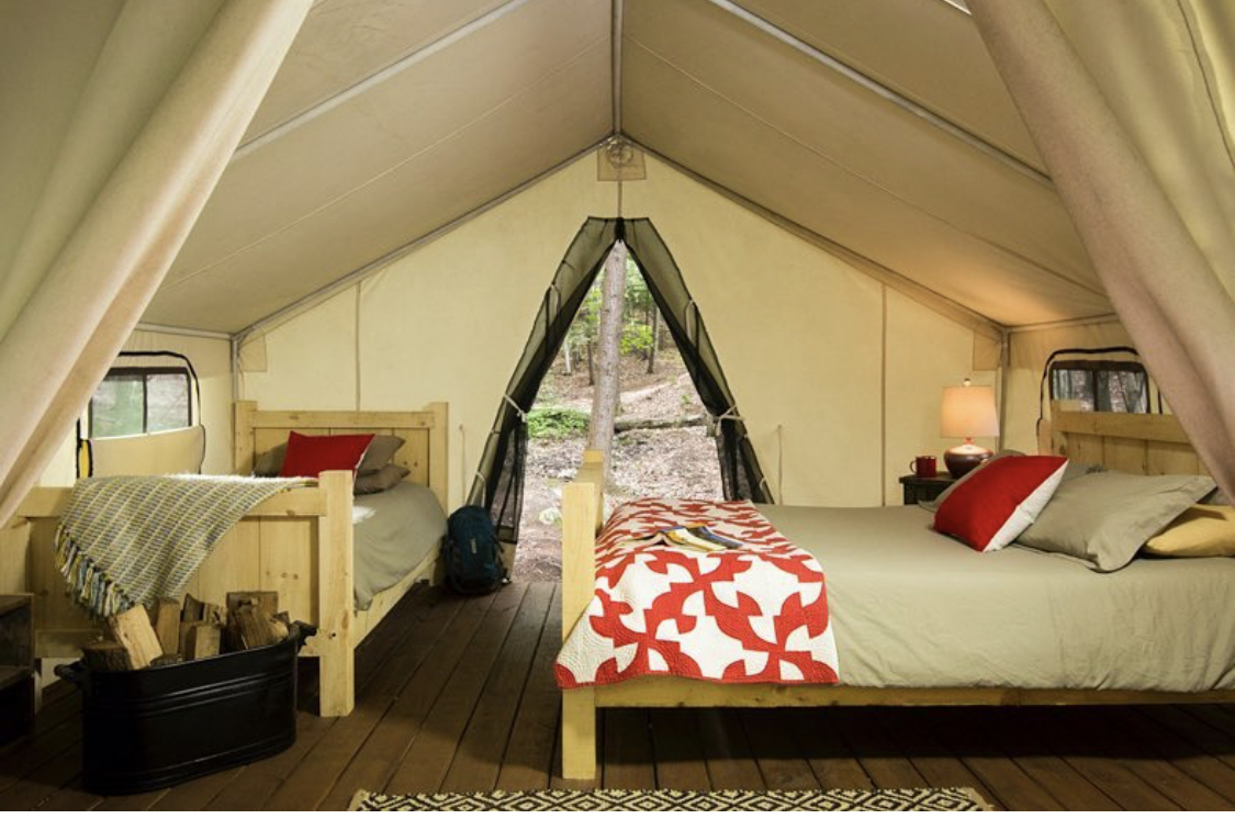 If you’re looking for an authentic Adirondack backcountry retreat, camp orenda is the place for you. Among the mountains in this pristine State Park, aspiring pioneers can enjoy their cozy canvas cabin, which is fully furnished with contemporary rustic-designed interiors, plush-down comforters, pillows, fresh linens, clean towels, lighting, ceiling fans, and convenience outlets. This all-inclusive campground offers daily dining with fresh farm ingredients from the camp’s on-site heirloom garden. Meals are cooked over an open wood flame using traditional cast iron skillets, griddles, and Dutch ovens for the ultimate glamping experience in the Adirondack wild.