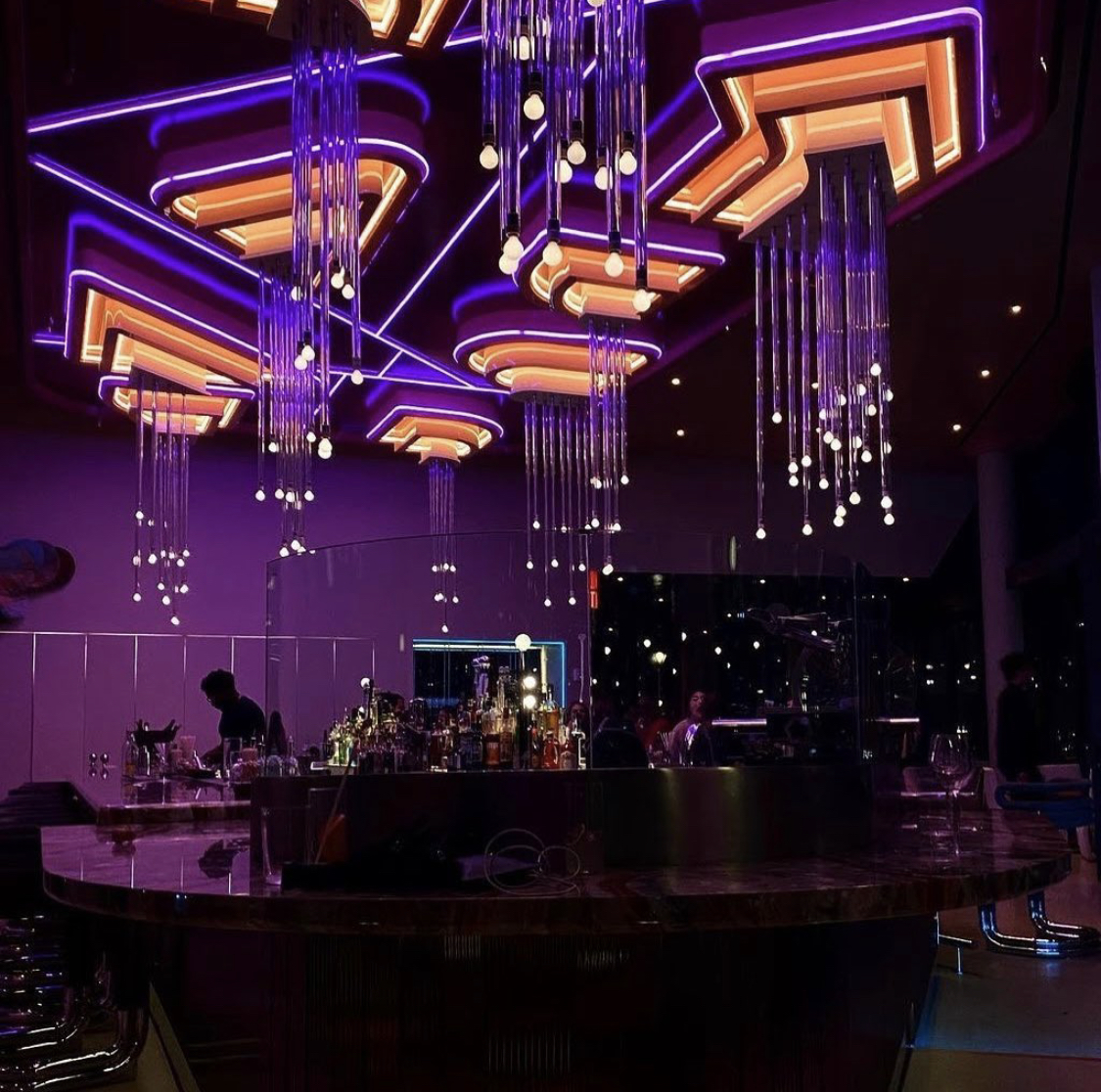 With breathtaking views of Manhattan and Queens, the Panorama Room boasts one of the best 360-degree views in the tri-borough area. The blend of futuristic, art deco, and plush velvet seating makes the ambiance of this rooftop bar fun, flirty, and perfect for your next gathering with friends or date night out. In addition to the views, the pink-hued marble bar is the main draw of the room with unique cocktails, picturesque high ceilings, and a neon chandelier á la Miami Vice.