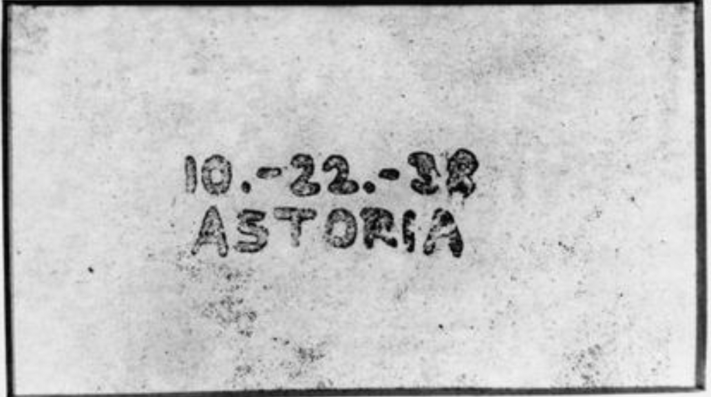 According the Carlson’s documents about the process, he wrote, “10-22-38 ASTORIA” in India ink on a glass slide. Then, Kornei prepared a zinc plate with sulfur coating, darkened the room, rubbed the sulfur surface with a cotton handkerchief to apply an electrostatic charge and then laid the slide on the plate, exposing it to a bright light.