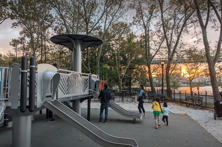 The playground was renovated in 1998, and a redesign in 2021 incorporated new play equipment and chess game tables. The comfort station on its south end was renovated most recently in 2021. With its striking views of both the Triborough and Hell Gate Bridges, this playground is one of the best in Astoria. The playground’s Charybdis, a Greek mythological figure who was the daughter of Poseidon, the god of the sea.