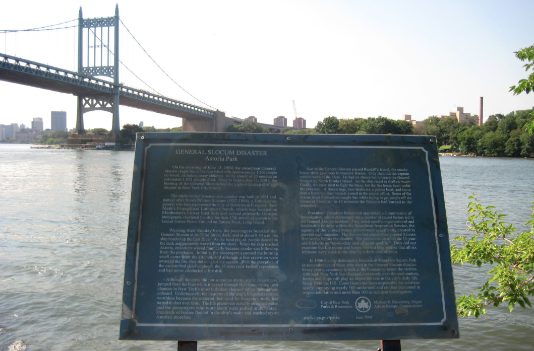The General Slocum Memorial Plaque at Astoria Park along Shore Road.