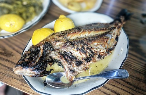 The interior is split into two parts, an interior bare bones room, and a covered (and temperature controlled) patio where most people choose to eat and drink. The Greek flag and the color blue are everywhere and so is the smell of amazing seafood features grilled whole porgies on the bone for $20 and their famous grilled octopus plate for $15.