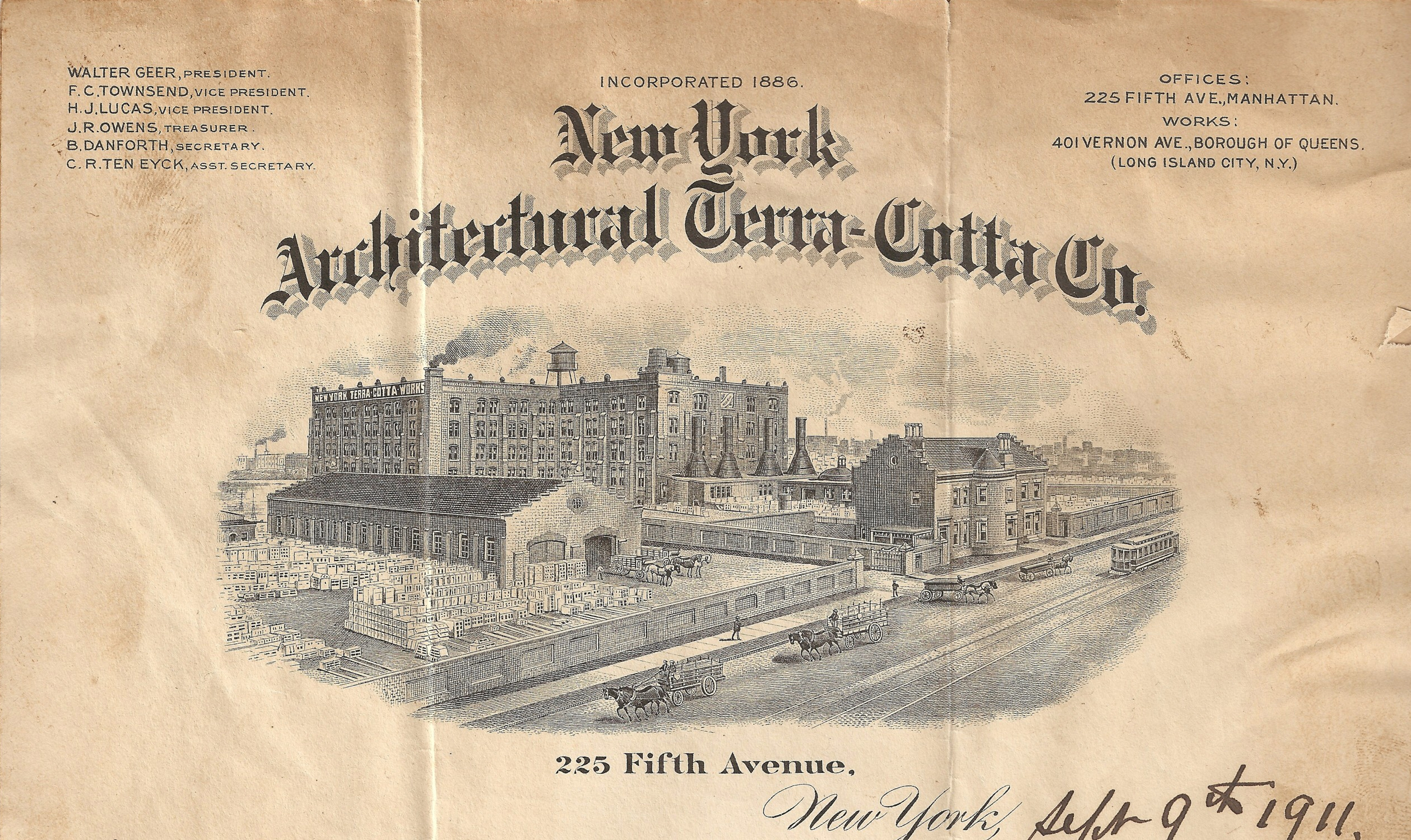 The NYATCW was in operation at what was then known as No. 401 Vernon Avenue in Long Island City, from 1886 until 1968. Of the forty-eight major terra cotta manufacturers in the United States, it was the only such plant situated in New York City. The NYATCW supplied architectural terra cotta for projects throughout the United States and Canada. Materials supplied from this location were used in constructing more than 2,000 buildings. Among the company’s most prominent contracts included Carnegie Hall and the Ansonia Hotel. Terra cotta became popular as a building material in the United States beginning in the 1870s and enjoyed a long tenure due to its flexibility, versatility, and durability.