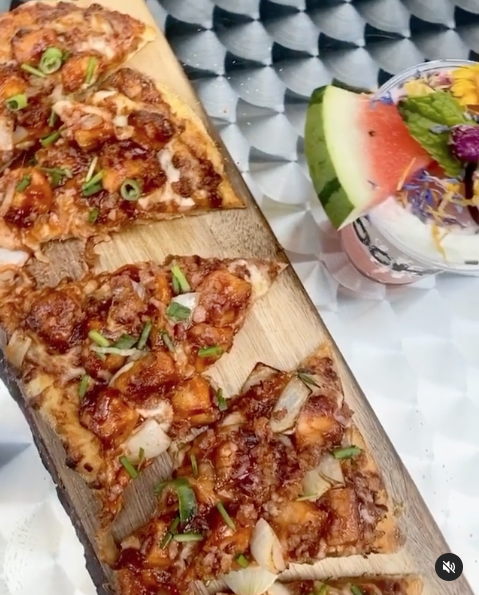 DOHA is known for its signature cocktails and premium sandwiches, but you can’t skip the buffalo chicken pizza.