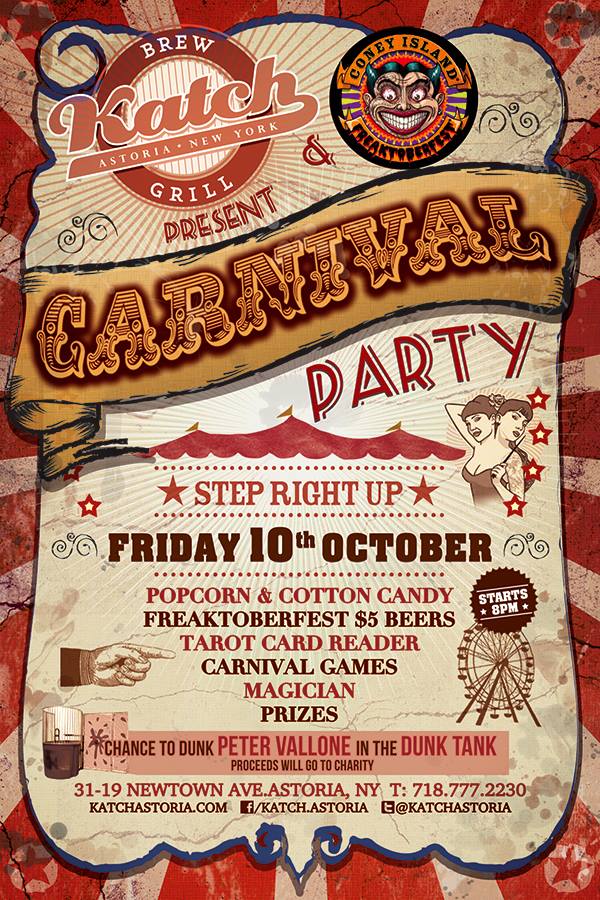 Tarot Card Readings. Drink Specials. Politicians in a Dunk Tank! The Carnival is coming to Katch, this Friday at 8pm in the heart of Astoria. This event is sponsored by Coney Island Brewing and their Freaktoberfest Beer will be on draft for just $5. The event is also raising money for Shareing & Careing Breast Cancer Support Services Charity.…