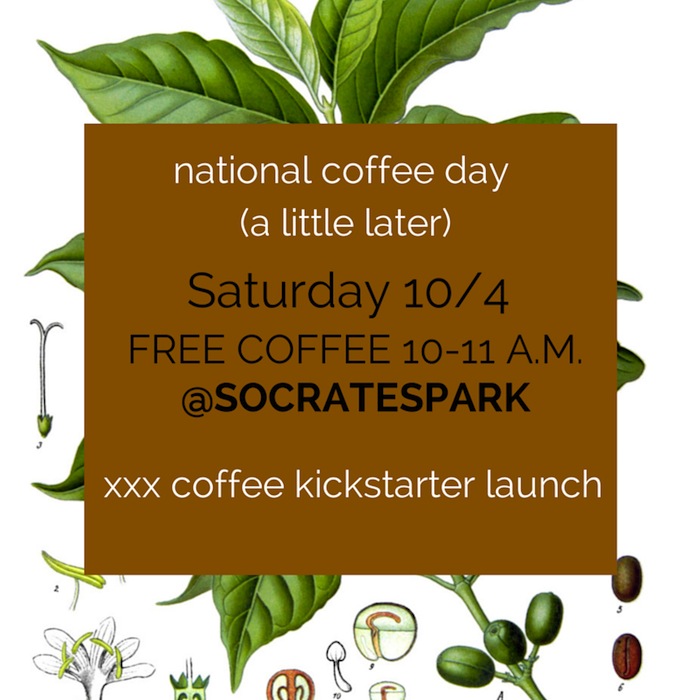 Oh, yes. There will be free coffee – tomorrow! You have exactly ONE hour to grab some free coffee in Socrates Sculpture Park! Get your caffeine fix on! In the meantime, check out the wonderful minds at XXX Coffee on Facebook.