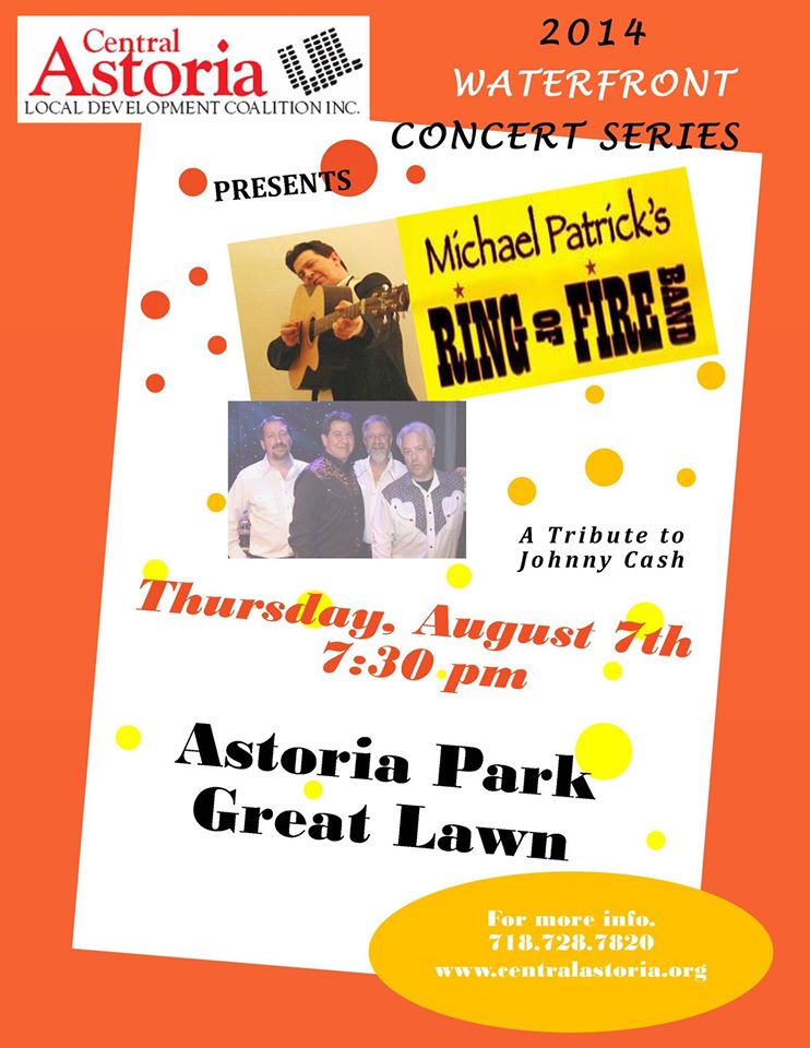CALDC 2014 Waterfront Concert Series continues with a musical tribute to “The Man In Black”, Johnny Cash featuring: MICHAEL PATRICK’S RING OF FIRE BAND When: Thursday, August 7th, 2014 at 7:30pm Where: ASTORIA PARK GREAT LAWN – Shore Boulevard between the Hell Gate Bridge and Astoria Pool Cost: FREE!!!! Bring a blanket or chair and…