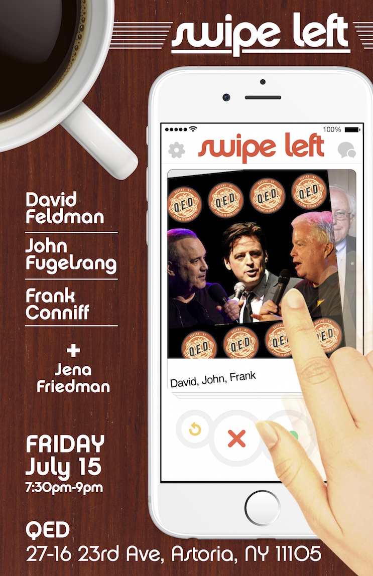 Swipe Left" is a monthly comedy show featuring John Fugelsang, Frank Conniff and David Feldman. Expect sharp, acerbic, self-effacing and politically minded comedy that do not preach to the converted. Featuring special guests! Featuring:John Fugelsang (Sirius XM's Tell Me Everything) David Feldman (Maya and Marty) Frank Conniff (Mystery Science Theater 3000)Jena Friedman (Daily Show) $10 in adv/…