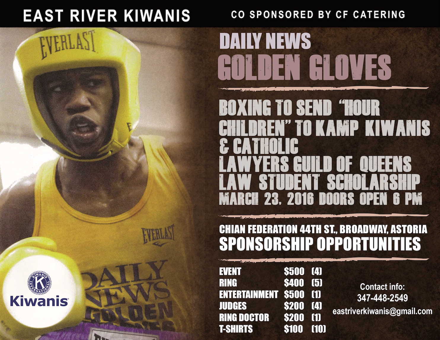 Come see some great boxing at a great venue and support the East River Kiwanis club as we support some Kamp Kiwanis, Hour Children and the Catholic Lawyers Guild's Scholarship program. Tickets start at $25 and up. The event will be held at the Chian Federation 44-01 Braodway Astoria, NY 11103. We will also have a…