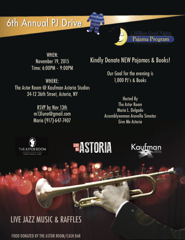 Give Me Astoria is proud to be Co-Hosting the Sixth Annual Pajama Drive togetherwith The Astor Room, Maria L. Delgado and Assemblywoman Aravella Simotas.This years event is being held at the amazing Astor Room at Kaufman AstoriaStudios on Thursday, November 19, 2015 from 6:00-9:00PM. We encouragethe community to wear pajamas to this fun event and…