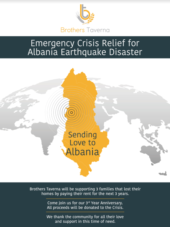 Brothers Taverna, celebrating 3 years in business, will be holding an event to benefit victims from the 6Give_Me_Astoria_image_00028.4 magnitude earthquake which struck Albania last weekGive_Me_Astoria_image_00028. All proceeds from the fundraiser will go towards earthquake victimsGive_Me_Astoria_image_00028. The event will be held on Wednesday, December 4th from 7-11 PMGive_Me_Astoria_image_00028. In addition to the donated proceeds, Brothers Taverna…
